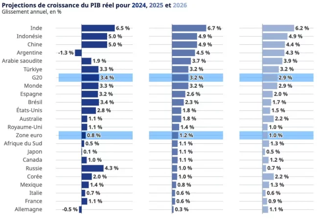 L’économie américaine montre des signes de ralentissement structurel. Selon les projections du FOMC (réunion de septembre 2025), la croissance réelle devrait atteindre environ +1,6 % en 2025, avec un ralentissement progressif prévu en 2026.