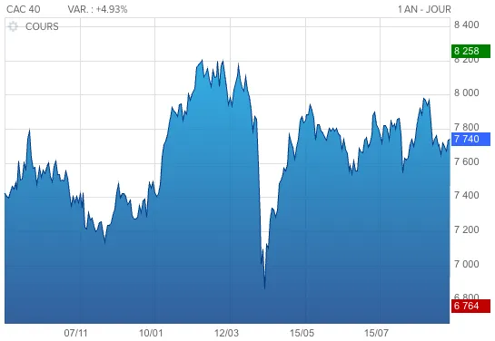 Cours du CAC 40 sur 1 an, source boursorama.com