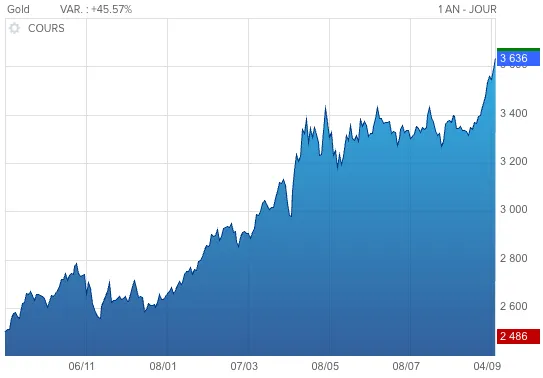 Cours de l'once d'or sur 1 an, source boursorama.com