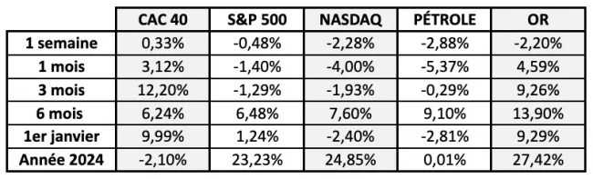 Les métaux précieux ont subi des pressions : l’argent enregistre la pire performance hebdomadaire (-5,5 %), tandis que l’or, plus résilient, corrige de 2 % mais conserve une hausse de +10,4 % depuis le début de l’année